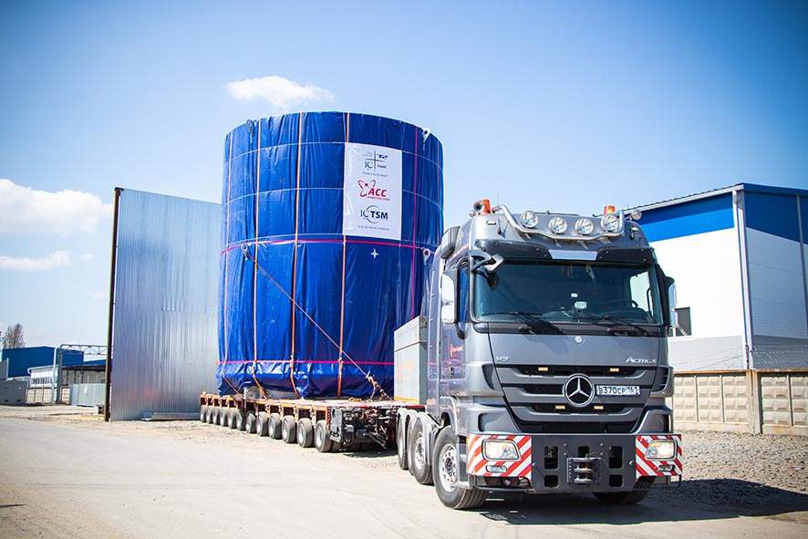 Облицовка прошла длинный путь от «АСС» до пункта назначения. Двое суток наш крупногабаритный груз добирался из цеха «Атомспецсервиса» до порта г. Волгодонска, было перекрыто движение всех видов транспорта, обесточены и демонтированы линии электропередач.