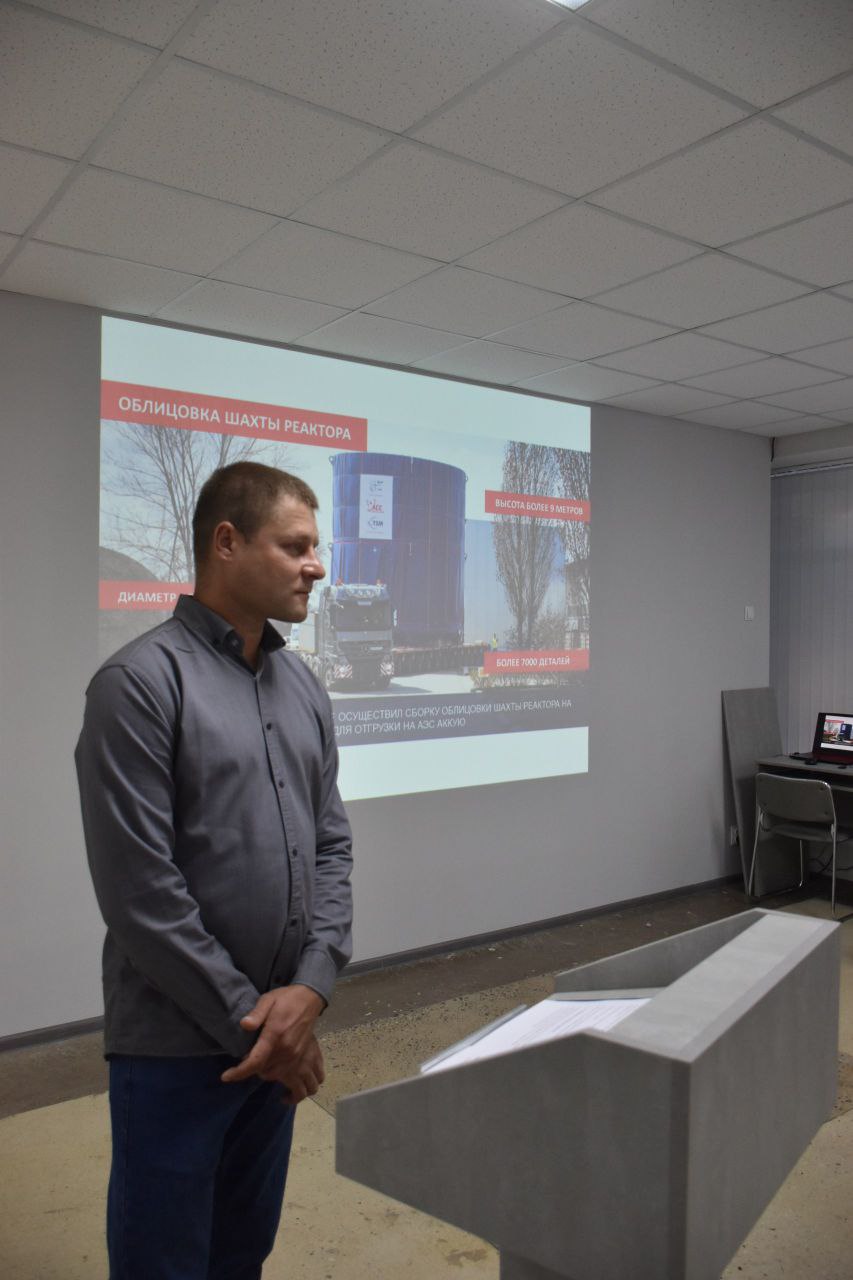 Вадим Евгеньевич Чухно, окончил «Волгодонский техникум металлообработки и машиностроения». Со студентами данного техникума Вадим поделился историями о наиболее сложных и ответственных изделиях, в которых ему пришлось участвовать. Рассказал, что для него важны не только технические навыки, но и умение быстро находить решения в экстремальных ситуациях. Вадим подчеркнул, что постоянное обучение и практика —ключ к успеху в его профессии, а его собственный путь начинался с простых заданий и постепенного освоения новых технологий.